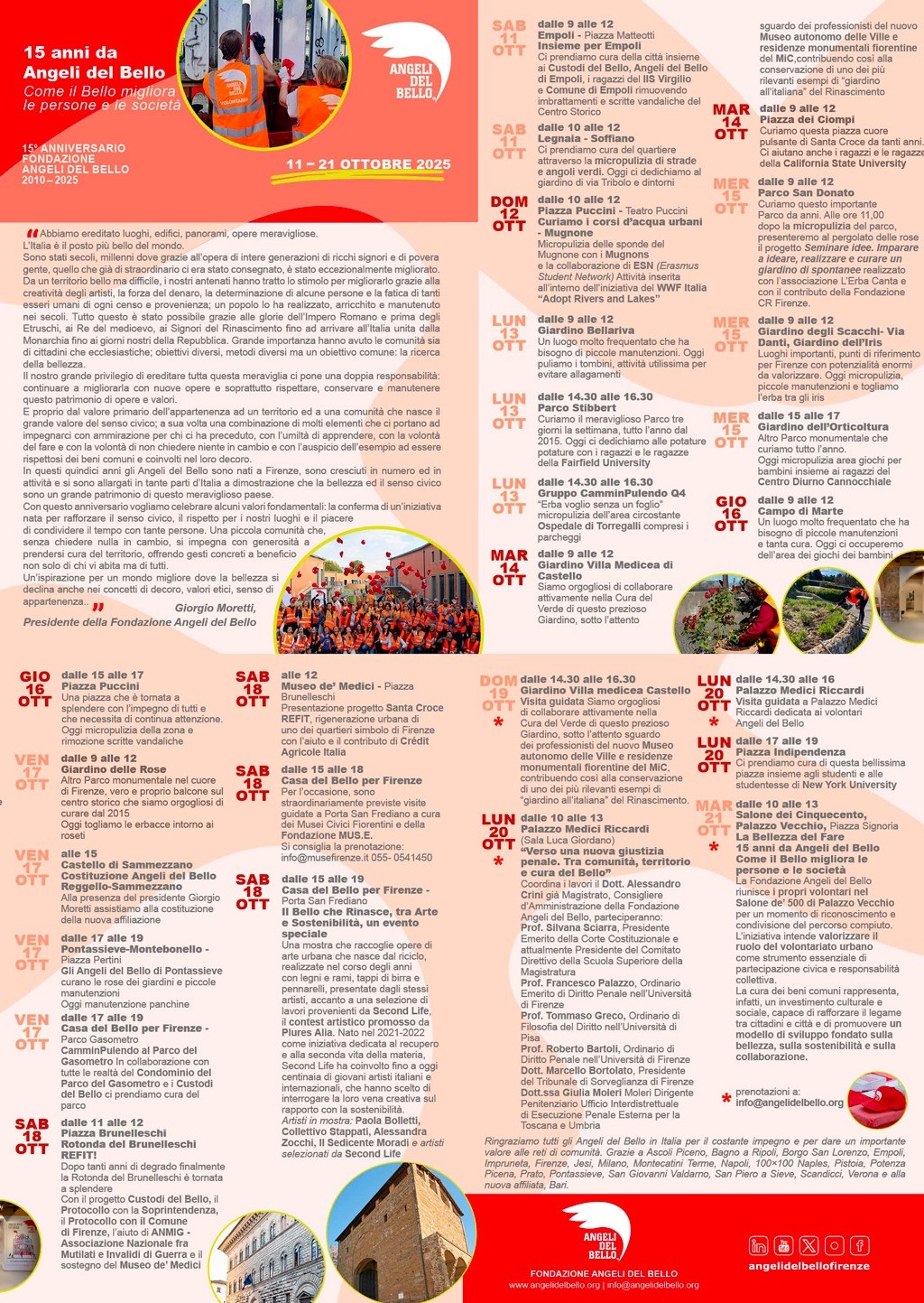 La Fondazione Angeli del Bello, attiva da 15 anni nella tutela della bellezza e del decoro di piazze, giardini, edifici e monumenti, festeggia il suo anniversario con un ricco calendario di eventi che, da oggi fino al 21 ottobre, coinvolgerà Firenze e i comuni affiliati in appuntamenti significativi che illustrano la forza del volontariato civico e il valore della bellezza come patrimonio comune. L’evento conclusivo si svolgerà martedì 21 ottobre nel Salone dei Cinquecento di Palazzo Vecchio con l’iniziativa “La Bellezza del Fare”, riunendo volontari provenienti da tutta Italia per un momento di riconoscimento e condivisione.