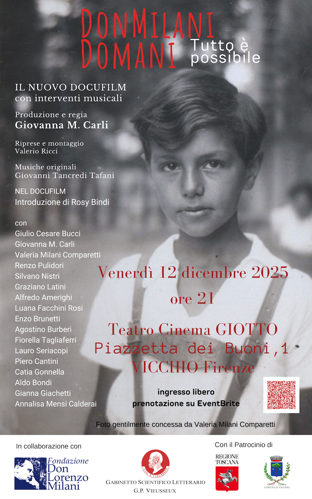 Il 12 dicembre 2025, alle ore 21, il Teatro Cinema Giotto di Vicchio presenterà la proiezione pubblica del nuovo docufilm “DonMilani Domani. Tutto è possibile“, un’opera che fonde cinema, ricerca storica e musica originale in un racconto potente e attuale dedicato alla figura di don Lorenzo Milani e al suo messaggio educativo, oggi più pertinente e necessario che mai, tema al quale è dedicato anche il libro associato.