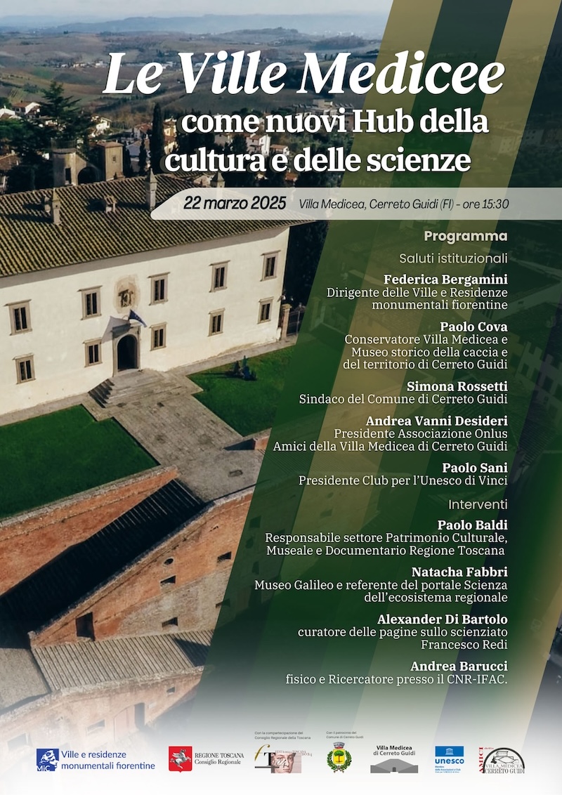 Sabato 22 marzo 2025, alle ore 15.30, avrà luogo presso la Villa Medicea di Cerreto Guidi l’evento intitolato “Le Ville Medicee come nuovi Hub della cultura e delle scienze“. Questo incontro è parte delle attività della Festa della Toscana 2024 “TOSCANA: terra di genio e di innovazione”, organizzato dal Club Per l’UNESCO di Vinci e dall’Associazione degli Amici della Villa Medicea di Cerreto Guidi.