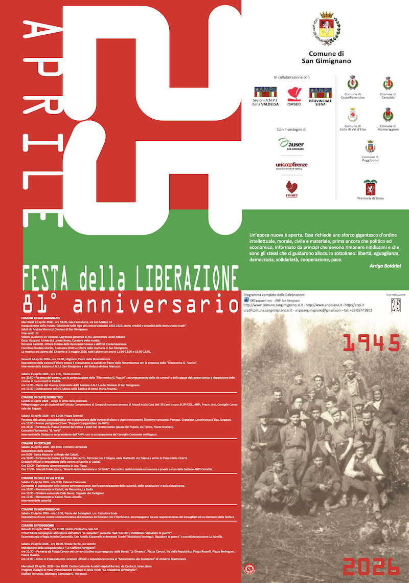 Poggibonsi. Il Comune, in collaborazione con la sezione Anpi, organizza una serie di eventi. Giovedì 23 aprile ci sarà una spettacolo teatrale, mentre il 25 aprile ci sarà una cerimonia commemorativa che includerà la deposizione della corona e un corteo. Il 29 aprile ci sarà un incontro in biblioteca per approfondire temi sulla Resistenza e sulla pace.