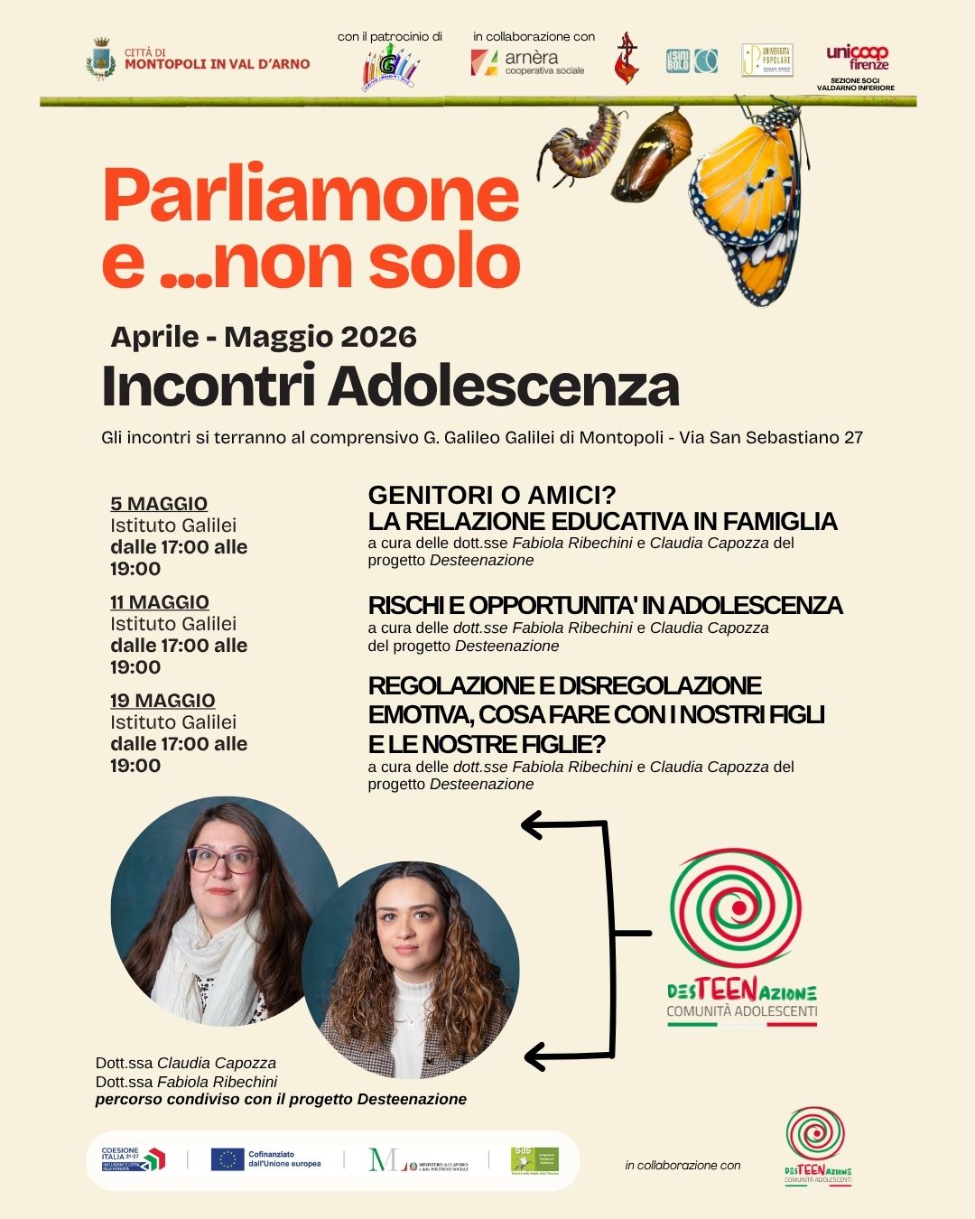 Dopo i primi incontri dedicati ai più piccoli, sta per avere inizio il ciclo sui temi dell’adolescenza, un’opportunità di riflessione e supporto per genitori ed educatori. Tutti gli eventi si svolgeranno presso l’Istituto Comprensivo G. Galileo Galilei (Via San Sebastiano 27, Montopoli in Val d’Arno) dalle ore 17 alle 19 e saranno guidati dalle Dott.sse Fabiola Ribechini e Claudia Capozza del progetto Desteenazione.