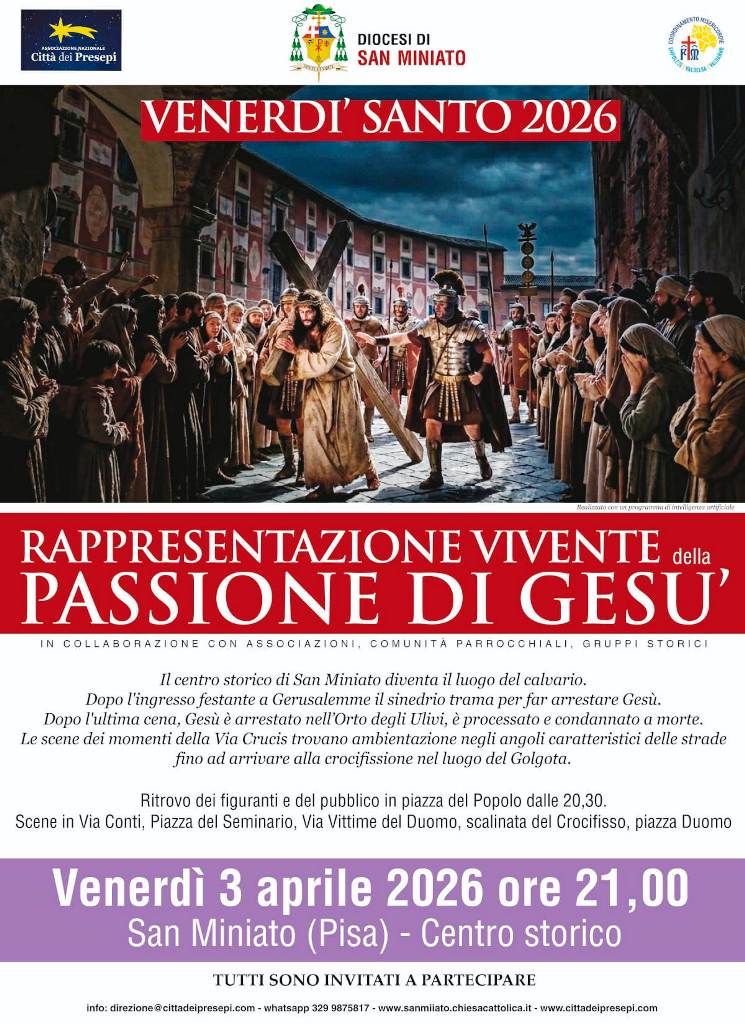 Venerdì 3 aprile, a partire dalle 21, gli angoli del centro storico di San Miniato si trasformeranno in un vasto palcoscenico all’aperto. Si svolgerà la Rappresentazione vivente della Passione di Gesù: non un semplice spettacolo nel senso tradizionale, ma qualcosa che si muove con delicatezza tra rito e teatro, tra devozione e bellezza.