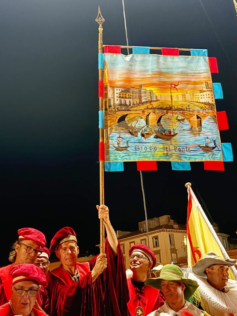 Intervento dell’assessore alle tradizioni, storia e identità di Pisa, Filippo Bedini: «Sono esattamente 90 anni dalla ripresa del Gioco del Ponte e l’inizio della moderna era della nostra tradizione: era il 29 giugno 1935 quando, dopo un lungo periodo di interruzione, si è tornati a disputare il Corteo storico sui Lungarni e la battaglia sul Ponte. Questo ha dato vita a un grandioso rilancio, permettendo al Gioco del Ponte di giungere fino ai giorni nostri. Anche la nostra Amministrazione ha avviato, dal 2019, un lungo e complesso percorso di rilancio del Gioco, un progetto segnato dalla pandemia che ha messo a rischio la sopravvivenza di tali eventi. Tuttavia, abbiamo riuscito a “ristrutturare” il Gioco, grazie a significativi investimenti economici e al potenziamento delle risorse umane coinvolte. I risultati di questo lavoro stanno iniziando a mostrarsi: le edizioni 2023 e 2024 hanno fatto registrare notevoli progressi, e l’anno che ci ha portato all’edizione 2025 ha segnato una crescita significativa sotto vari aspetti, dalla produzione culturale alla presenza rinnovata nelle scuole da parte delle Magistrature. Il Gioco deve essere vissuto per tutto l’anno e dalla città intera: solo così potrà avere un futuro luminoso, degno del suo grande passato, e la nostra missione di “tradere”, tramandare e far crescere una delle più importanti tradizioni di Pisa sarà compiuta».