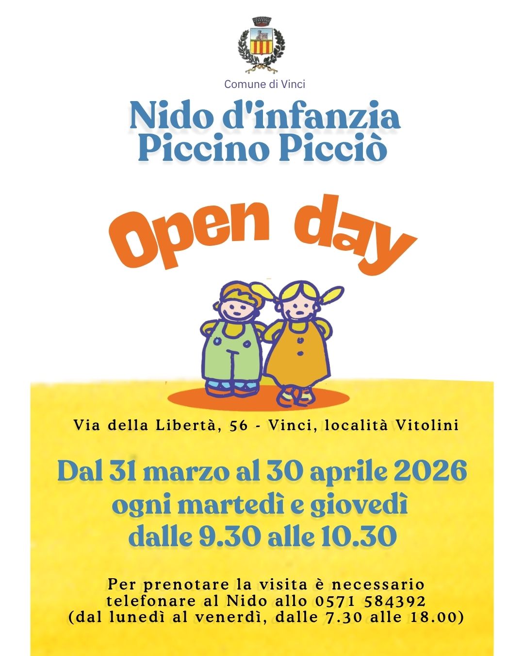 Al Piccino Picciò di Vitolini, gli open day si svolgeranno dalle 9.30 alle 10.30 ogni martedì e giovedì dal 31 marzo al 30 aprile 2026 (previo appuntamento telefonico al numero 0571584392 dal lunedì al venerdì, dalle 7.30 alle 18.00).