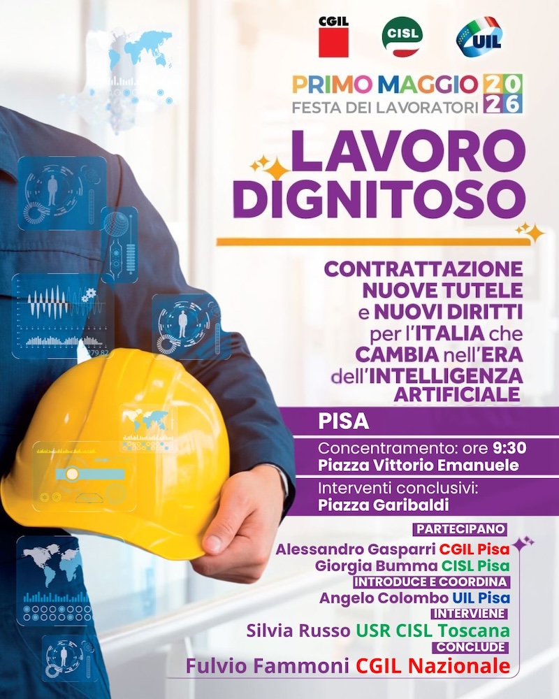 Il Primo Maggio 2026 ritorna a Pisa come fulcro delle celebrazioni, con iniziative anche a Pomarance e Montecalvoli, all’insegna del “lavoro dignitoso“, in un contesto provinciale caratterizzato da una crisi industriale sempre più strutturale. Le segreterie territoriali di CGIL, CISL e UIL di Pisa evidenziano congiuntamente che: “Non ci troviamo di fronte a una crisi temporanea, ma a una potenziale evoluzione del sistema produttivo. Pisa è ancora in equilibrio, ma il tempo per agire si sta riducendo”.