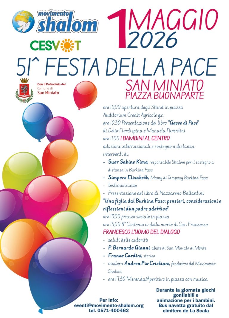 Quest’anno la 51ª Festa della Pace, organizzata da Shalom, presenta numerose novità. Abbiamo scelto la storica città di San Miniato, con la splendida Piazza Buonaparte, abbandonando così la tradizionale “scampagnata” a Collegalli. Quest’ultima, infatti, metteva in difficoltà i numerosi partecipanti storici a causa della mancanza di parcheggi e di strutture adeguate in caso di maltempo.