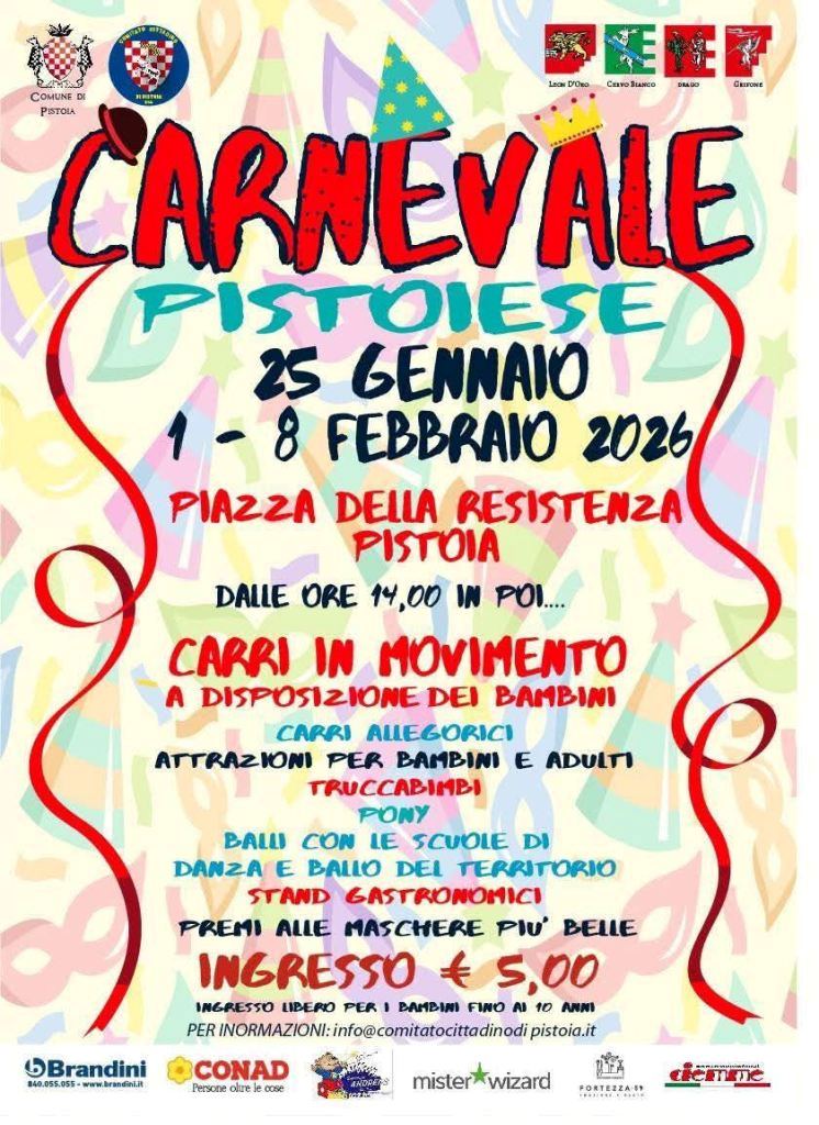 Torna a Pistoia l’appuntamento con il Carnevale, una celebrazione che unisce tradizione popolare e voglia di convivialità. L’edizione di quest’anno offre tre giorni di festa in piazza della Resistenza, il fulcro della manifestazione. La prima sfilata è prevista per domenica 25 gennaio, seguita dagli eventi di domenica 1 e domenica 8 febbraio. Se le condizioni meteorologiche non lo permetteranno, una delle sfilate potrà essere riprogrammata domenica 15 febbraio. L’iniziativa è organizzata dal Comitato cittadino del Carnevale, con la collaborazione del Comune di Pistoia, per valorizzare una tradizione molto apprezzata, capace ogni anno di attrarre famiglie, bambini e visitatori in un clima festoso.