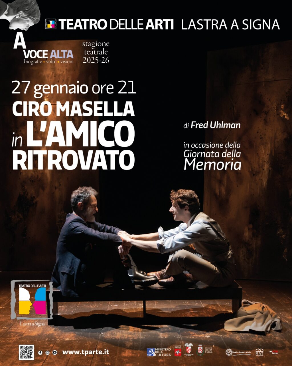 In occasione del Giorno della Memoria, domani martedì 27 gennaio 2026 alle ore 21:00, il Teatro delle Arti di Lastra a Signa presenterà L’amico ritrovato, uno spettacolo teatrale ispirato al celebre romanzo di Fred Uhlman, con adattamento e regia a cura di Ciro Masella.