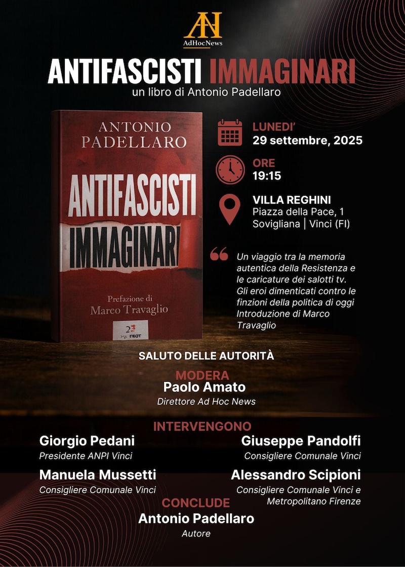 Il 29 settembre 2025, alle ore 19:15, presso Villa Reghini (Piazza della Pace, 1, Sovigliana), avrà luogo la presentazione del libro “Antifascisti Immaginari” di Antonio Padellaro, con prefazione di Marco Travaglio. L’evento, organizzato da Ad Hoc News, si preannuncia come un’importante occasione di riflessione sulla vera memoria della Resistenza e il suo significato nella coscienza civile nazionale, superando le “finzioni della politica contemporanea”.