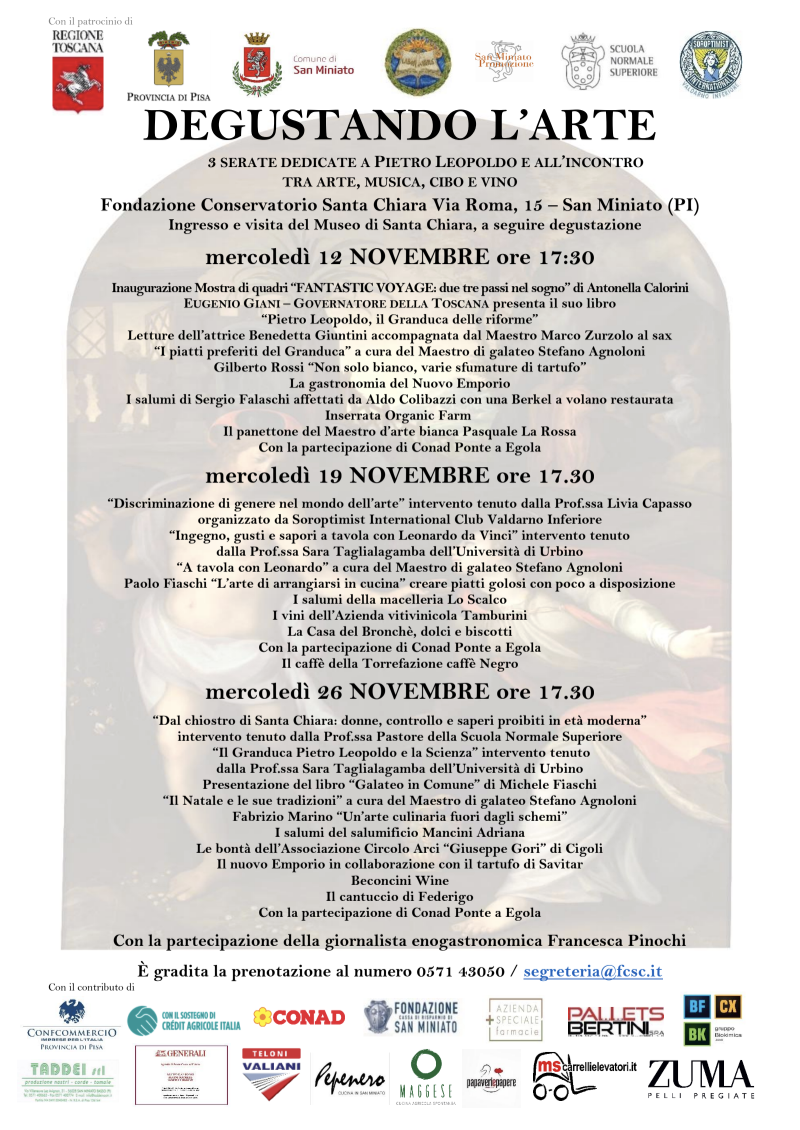 Oltre alla cultura, un aspetto fondamentale degli eventi è il gusto, con i prodotti di aziende locali e vitivinicole. Ogni incontro è ulteriormente arricchito dalle creazioni culinarie di tre chef di San Miniato: dopo il primo evento con le ricette di Gilberto Rossi, il 19 sarà la volta di Paolo Fiaschi e il 26 di Fabrizio Marino. Il Museo del Conservatorio di Santa Chiara sarà inoltre visitabile con tutte le sue opere e con la mostra, organizzata tra gli spazi storici del complesso, di …