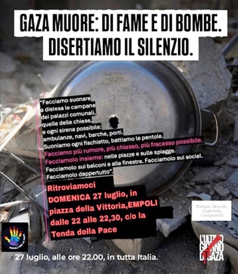 Empoli per la Pace sostiene l’iniziativa nazionale “Gaza muore: disertiamo il silenzio” e invita tutta la cittadinanza a partecipare alla mobilitazione simbolica e sonora domenica 27 luglio, dalle ore 22.00 alle 22.30 in Piazza della Vittoria, presso la Tenda della Pace.