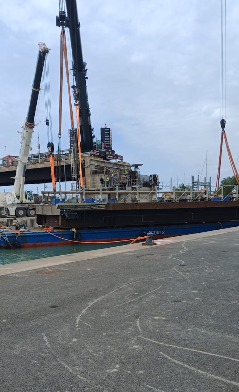 27–30 marzo (inizio lavori): scelta audace ma vincente — lavorare con l’impalcato a terra invece che in quota, per massimizzare la sicurezza degli operatori e velocizzare i tempi. Il ponte è stato alleggerito, sono state predisposte quattro gru, ed è stato sollevato e posizionato su chiatta navale in banchina portuale.