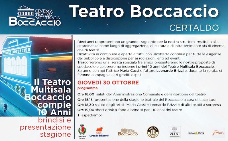 L’evento rappresenterà l’opportunità per brindare insieme a un decennio di traguardi e per svelare in anteprima la nuova stagione teatrale 2025/2026, con un’offerta pensata per soddisfare tutti i gusti e tutte le età. In questi dieci anni, il Boccaccio è diventato un punto di riferimento culturale per la comunità: un luogo di aggregazione, partecipazione e intrattenimento, capace di fondere teatro e cinema in un’unica realtà vivace e accessibile, aperta anche alla collaborazione con associazioni e enti locali. Ospiti speciali della serata saranno gli attori Maria Cassi e Leonardo Brizzi, protagonisti di numerosi successi teatrali nazionali, che porteranno il loro saluto al pubblico. Sono attesi anche ospiti a sorpresa che renderanno l’evento ancora più vivace.