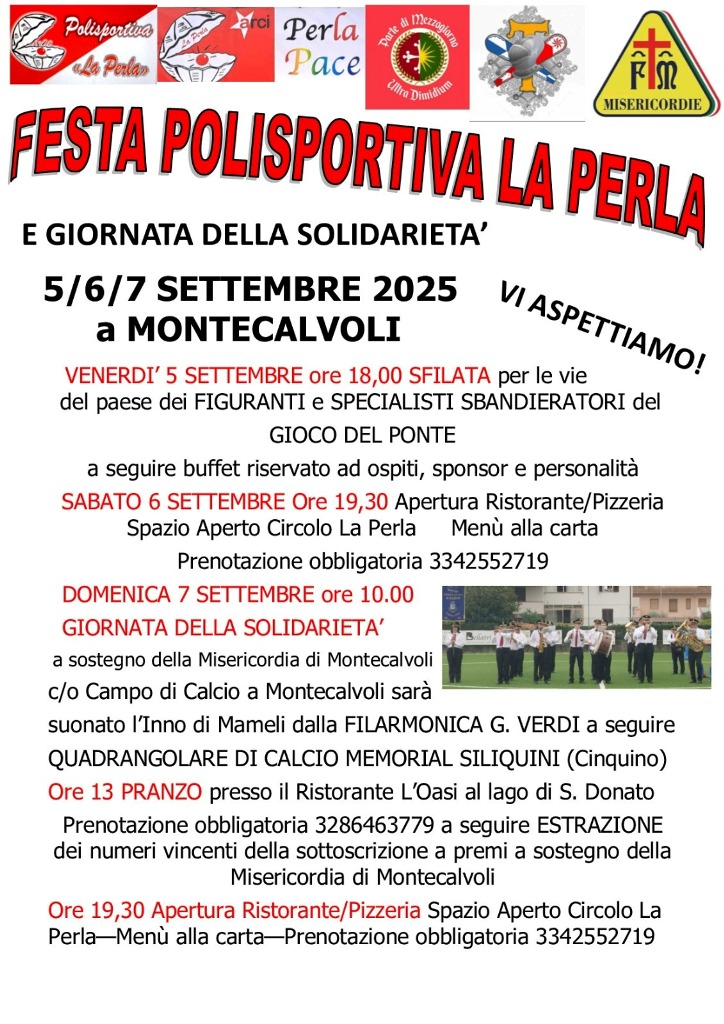 La giornata di domenica inizierà alle ore 10,00 presso il campo sportivo di Montecalvoli con l’apertura musicale della Filarmonica Giuseppe Verdi di Santa Maria a Monte, che eseguirà l’inno di Mameli. Seguirà la presentazione delle squadre di calcio – La Perla Over 40, Misericordie Pisane, Polizia di Stato commissariato di Pontedera e raggruppamento delle altre forze dell’ordine – che parteciperanno al quadrangolare della solidarietà.