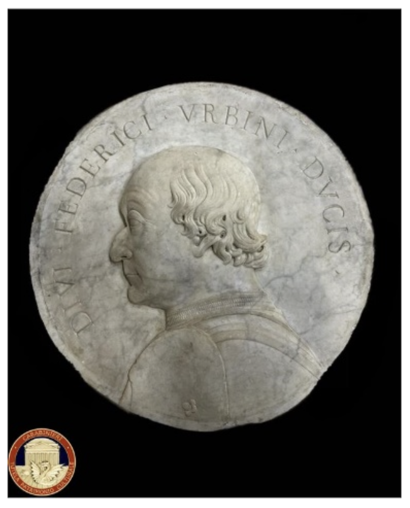 Medaglione raffigurante il busto del duca Federico da Montefeltro, attribuito allo scultore Domenico Rosselli (1439-1498), diametro 50 cm, marmo bianco, lavorato in bassorilievo.