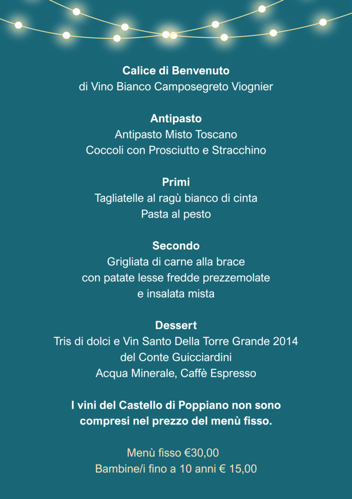 Il menù della serata include un calice di benvenuto con Viognier bianco Camposegreto, seguito da un ricco antipasto toscano con coccoli, prosciutto e stracchino. I primi piatti saranno tagliatelle al ragù bianco di cinta e pasta al pesto. A seguire, una grigliata mista di carne alla brace accompagnata da contorni freschi, e per finire un tris di dolci con Vin Santo Della Torre Grande 2014 del Conte Guicciardini, accompagnati da acqua e caffè. Il tutto al prezzo fisso di 30 euro, mentre per i bambini fino a 10 anni la quota è di 15 euro. I vini del Castello di Poppiano non sono inclusi nel prezzo.
