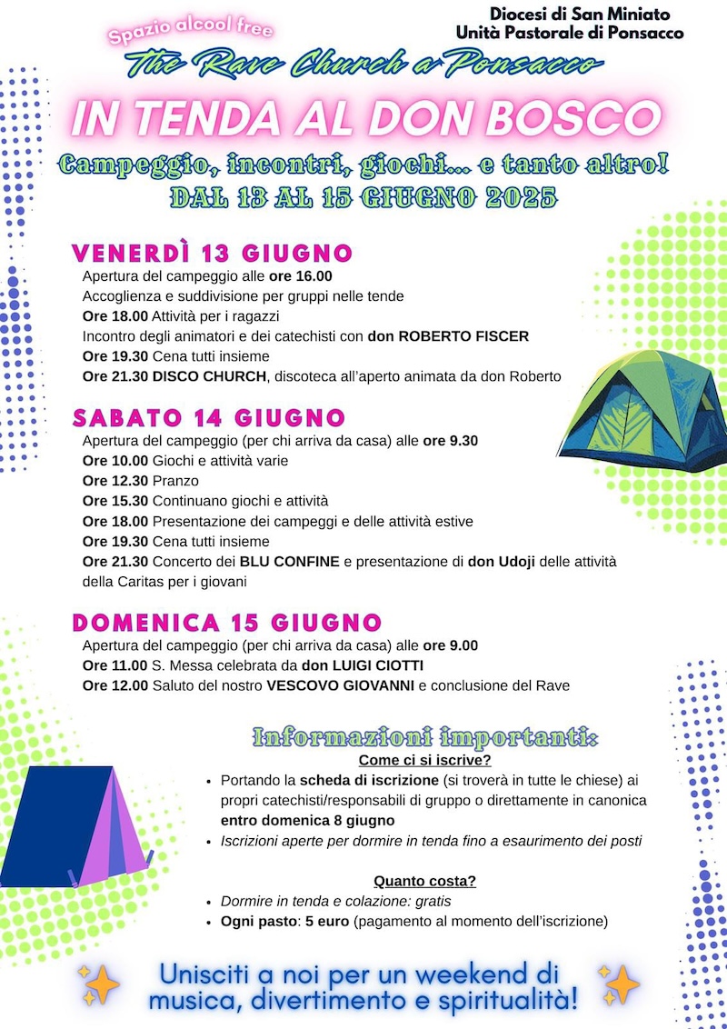 Tre giorni all’insegna del campeggio, della festa, della musica e della fede. Un weekend che unisce divertimento e spiritualità, organizzato dalla Parrocchia di Ponsacco, che invita i giovani a partecipare al “The Rave Church a Ponsacco“, dal 13 al 15 giugno presso la chiesa Don Bosco in via Livornese. “Bambini e ragazzi della nostra comunità vi aspettiamo per festeggiare insieme”, così si legge sulla pagina Facebook della Parrocchia guidata da don Armando Zappolini. “Vi attendono giochi, attività, sorprese, testimonianze di fede e… tanta musica!”.
